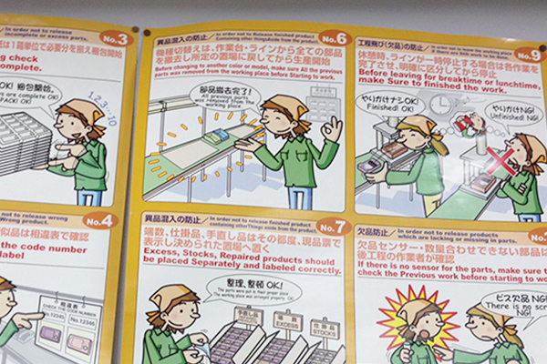 工場内では作業ラインごとに写真を使った作業手順書や仕様書を作成して、適切に掲示しています。